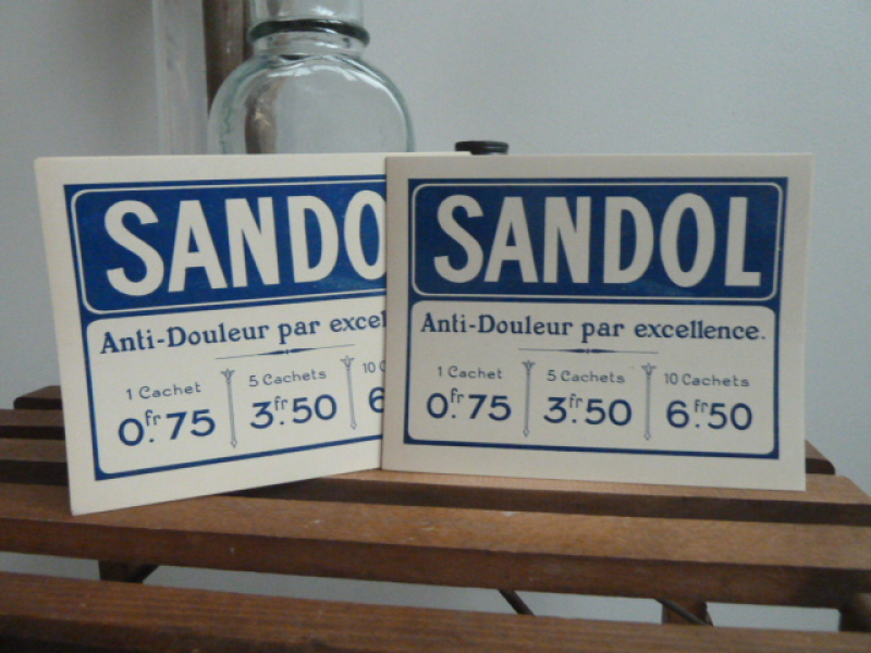 Ancienne étiquette affiche cartonnée de la marque SANDOL avec pour slogan "anti douleur par excellence 1 sachet 0.75 francs / 5 sachets 3.50€ francs / 10 sachets 10.50 francs". Publicité vintage provenant d'une ancienne usine pharmaceutique d'Orléans Loiret. Très sympa encadrée dans une salle de bain. l15 x h12. 2 Disponibles. 5 € pièce