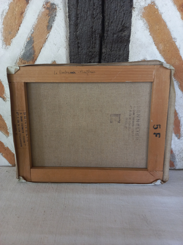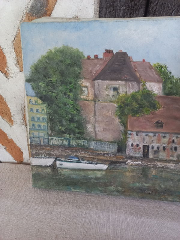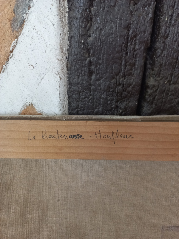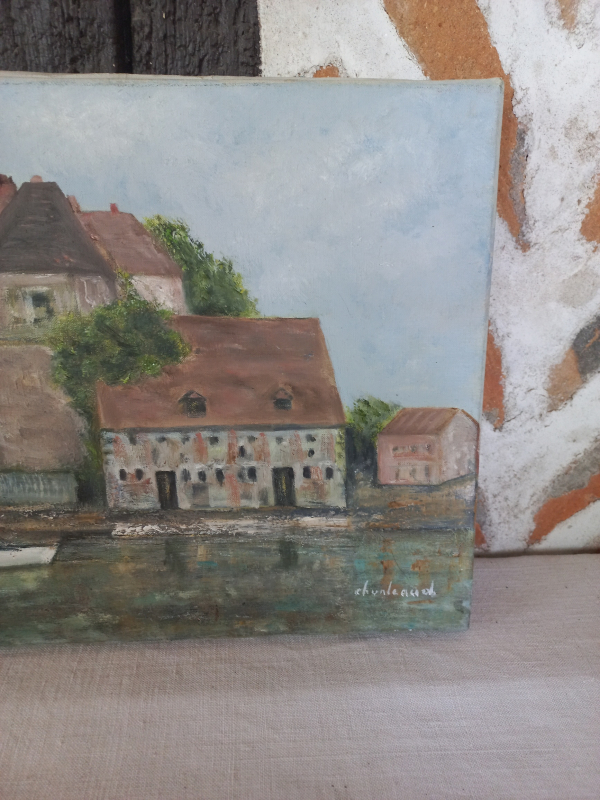 Tableau peinture huile sur toile représentant la commanderie de Honfleur. Jolies teintes delavées. Sennelier Paris. Signé Chunleaud. l35 xh27 xp2