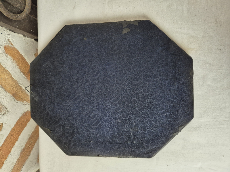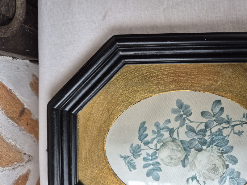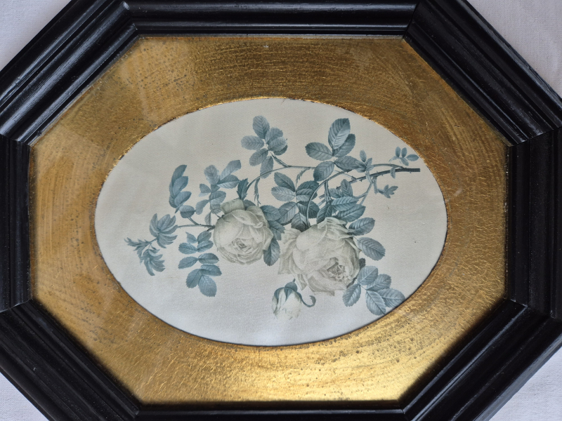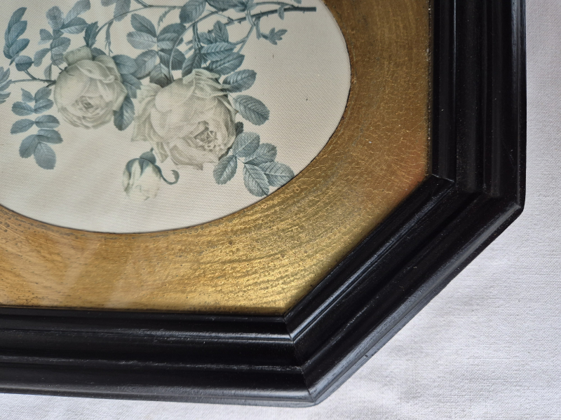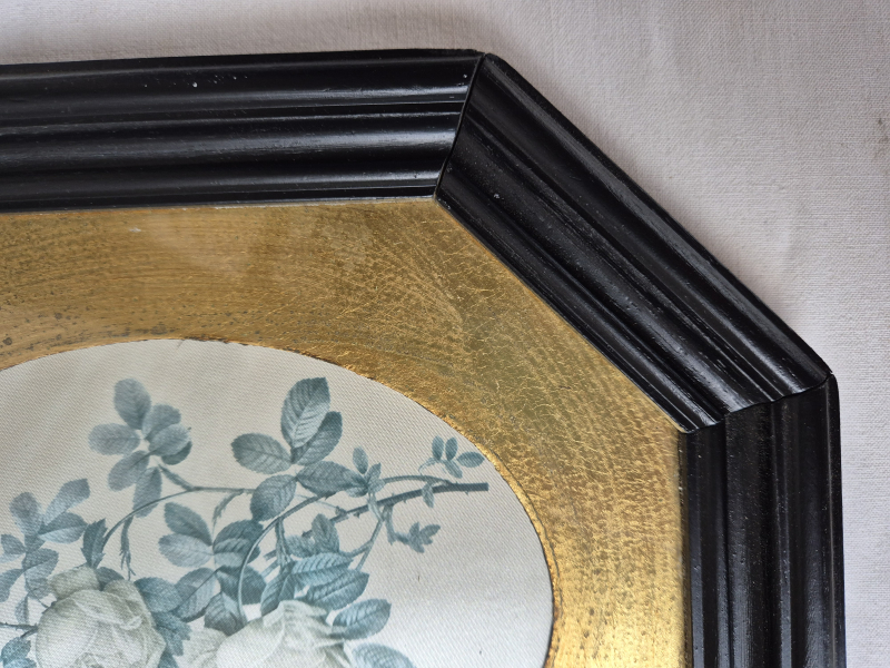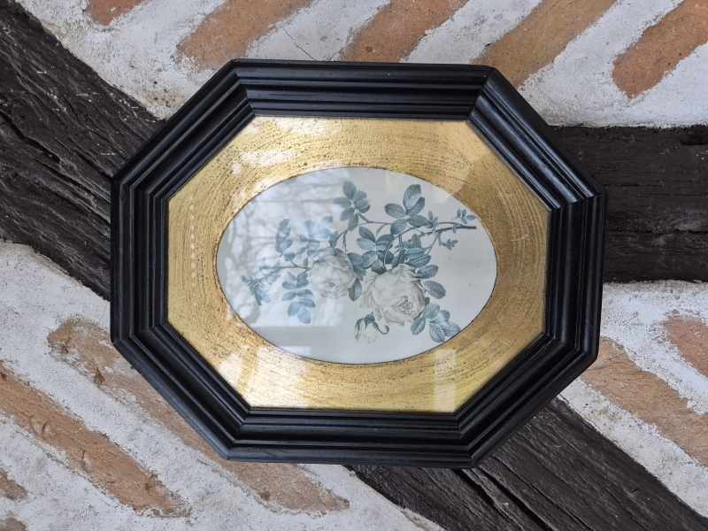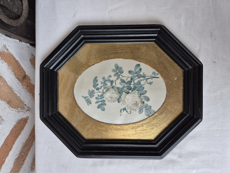 Elegant tableau octogonal représentant des roses anciennes. Cadre bois noir avec verre. Décor : roses anciennes sur tissu avec teintes délavées mises en valeur par un passe partout forme médaillon doré. Jolie patiné dorée vieillie. Crochet arrière. L25 x h30 x p2