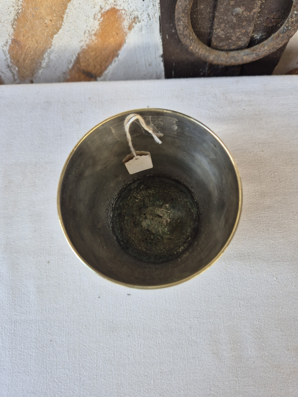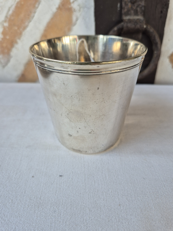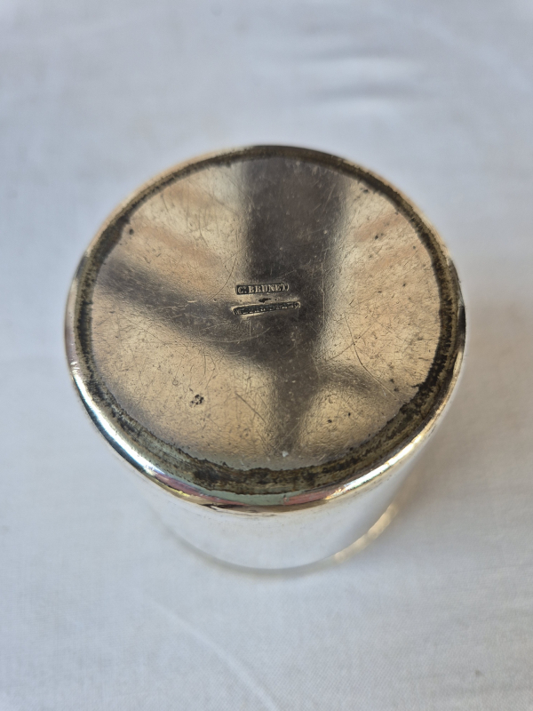 Timbale argentée ancienne. Design sobre. Jolie bordure. Intérieur vieilli. Poinçon "Cie Brunet". 1 petit renfoncement en partie basse. L8 x h8 x p8.