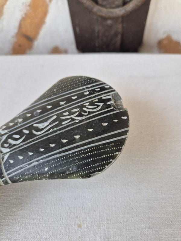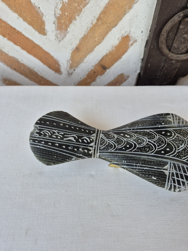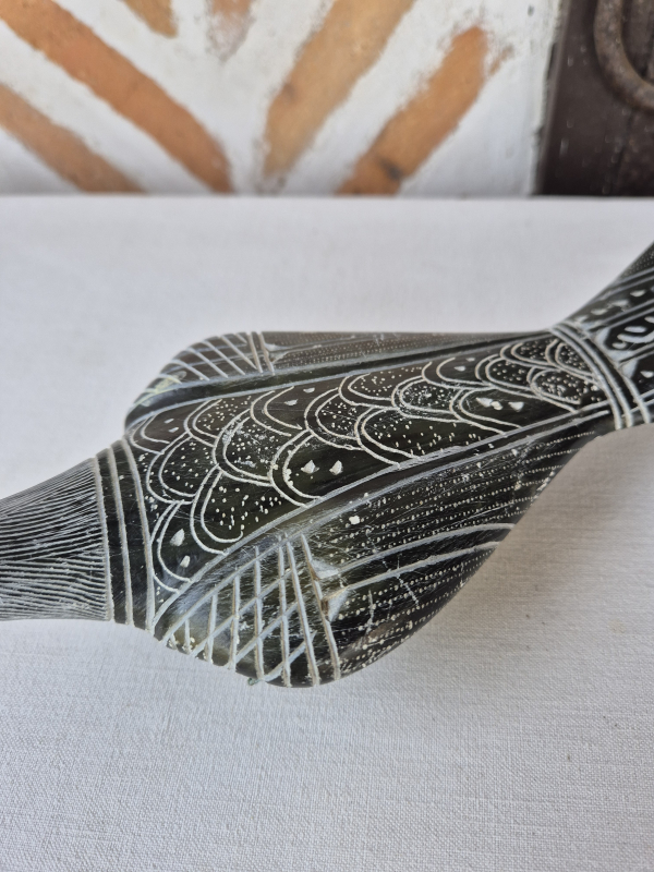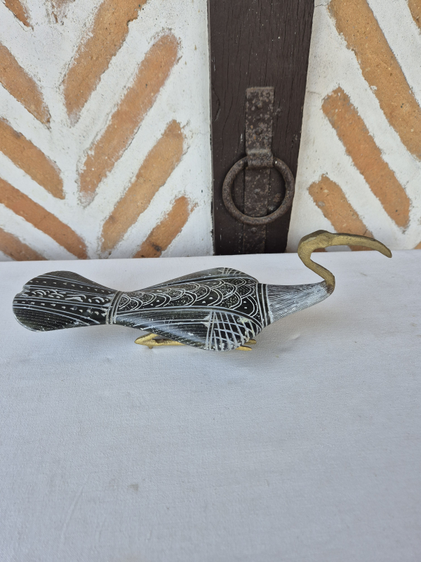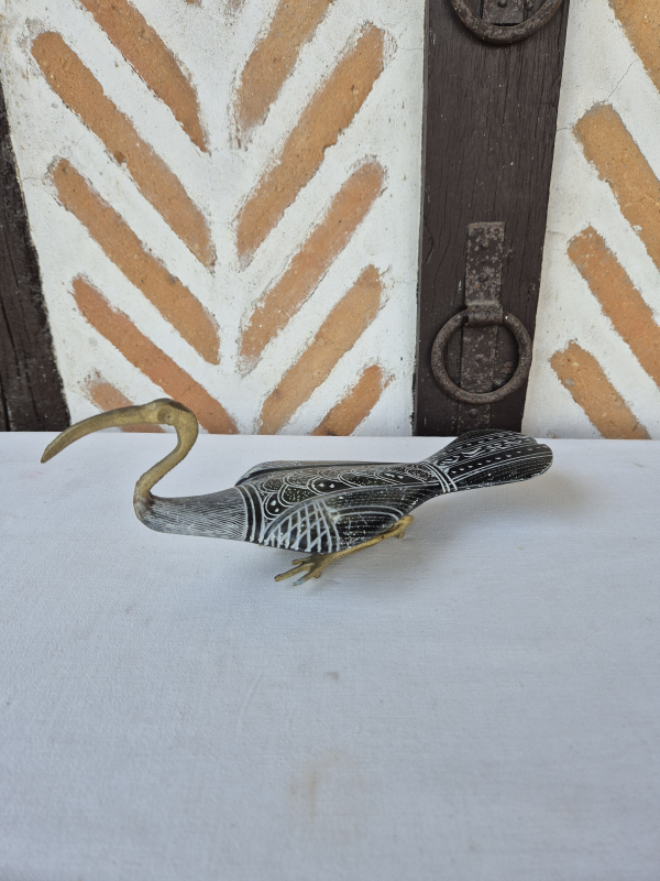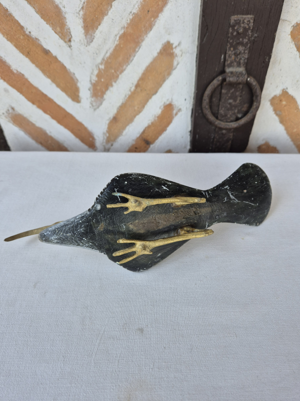 Sculpture oiseau Ibis. Corps en pierre de savon sculpté. Pattes et tête en laiton massif. Création artisanale. 1 éclat à la queue. Provenance Égypte. L29 x h11 x p10