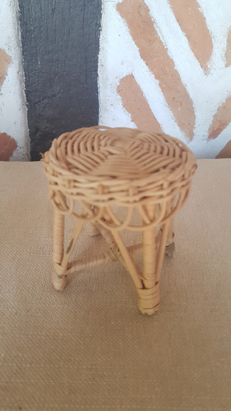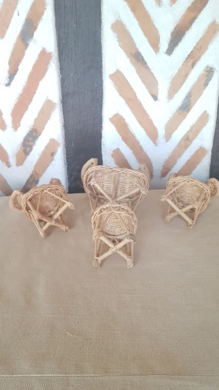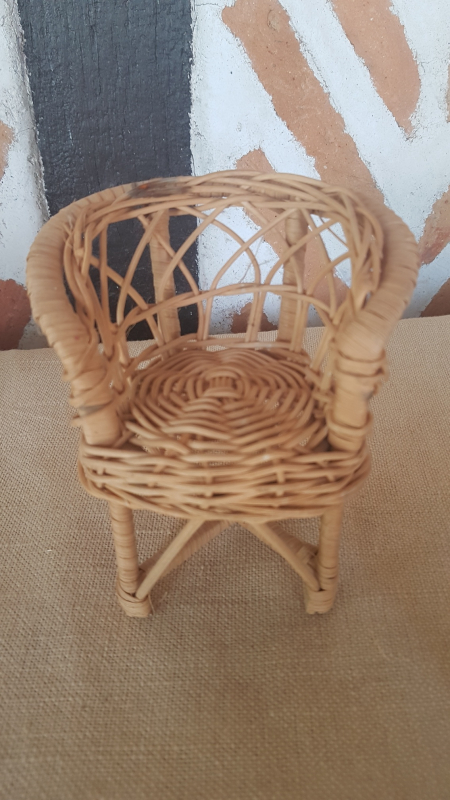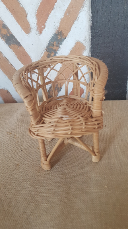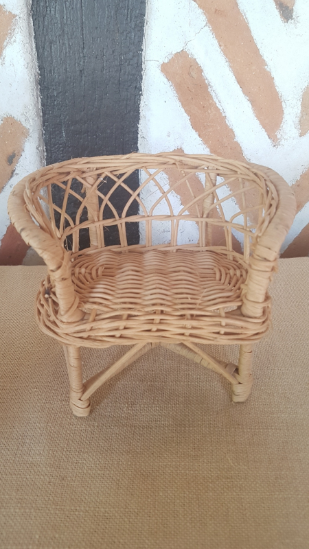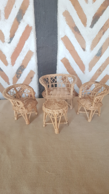 Charmant salon de poupée en osier naturel. Epoque 1980.2 fauteuils l12xh13xp11. Canapé banquette l16xh13xp11. Table ronde l8.5xh9xp8.5. Idéale pour poupées barbie.