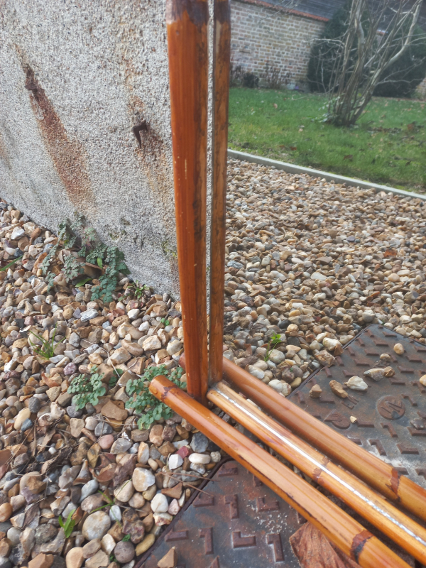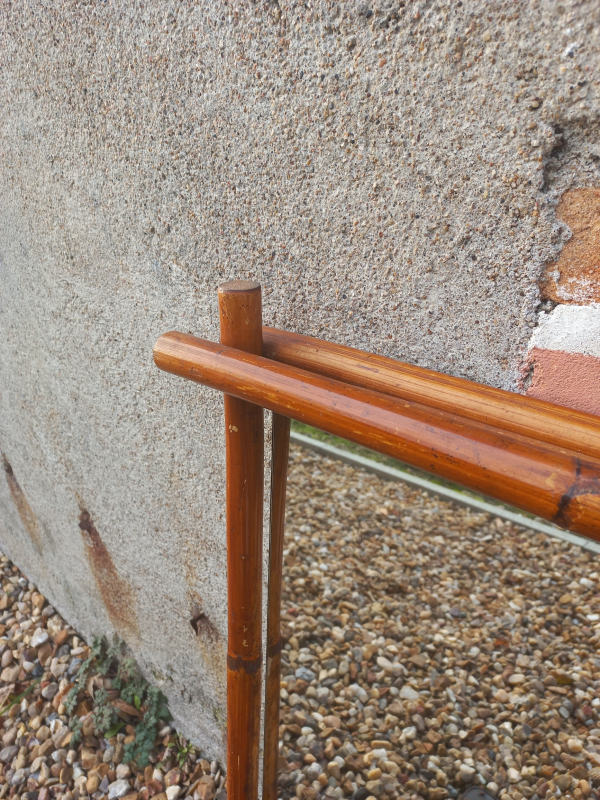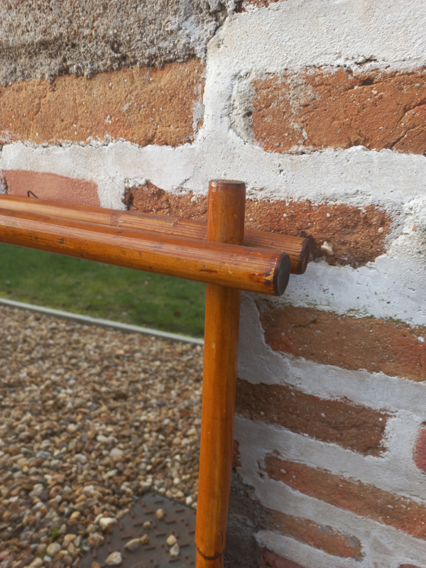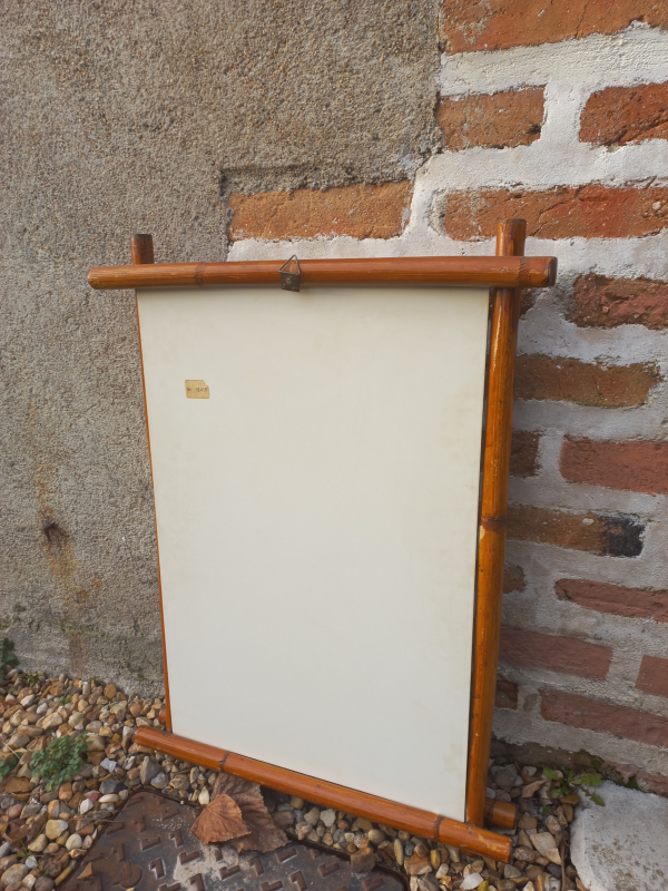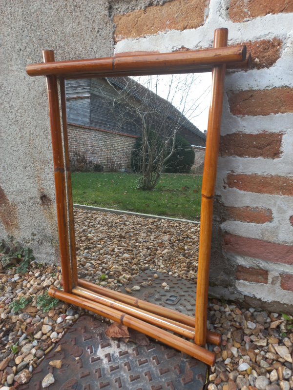 Grand miroir bambou vintage. Format portrait. Design intemporel. Teinte bois. Miroir d'origine. Format portrait. Epoque 1980. Absence de fond rigide : uniquement envoi cocolis. Bel effet au dessus d'une console ou en guise de miroir de salle de bain. L50xh70xp7.