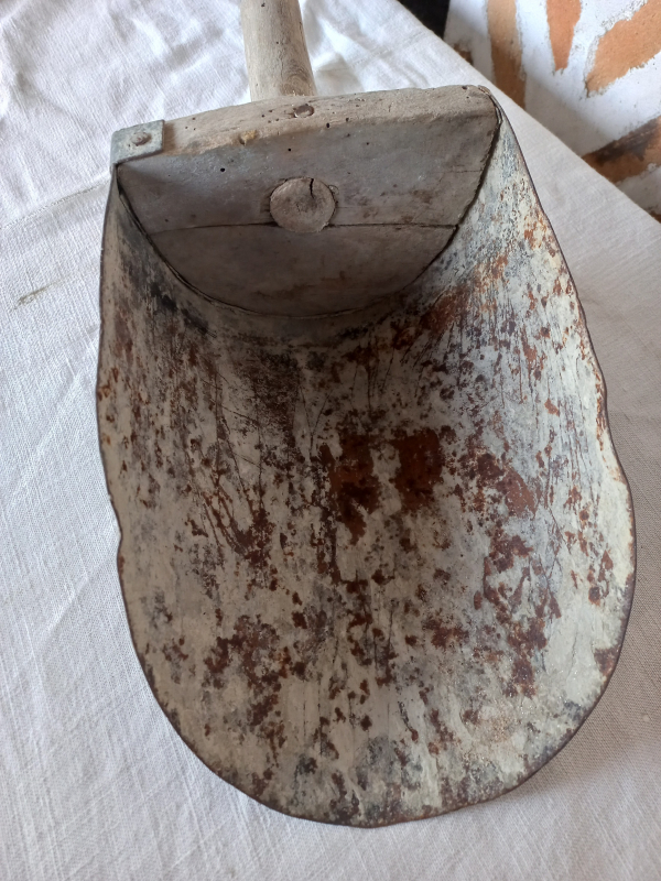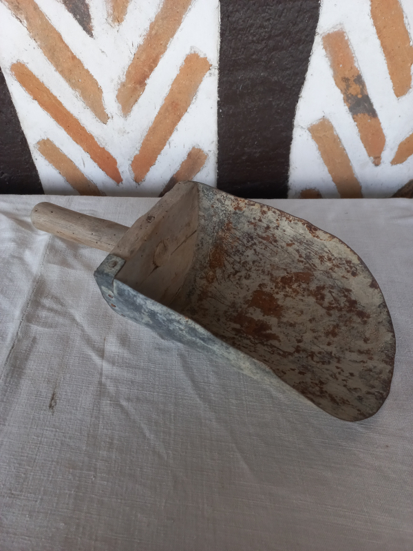 Ancienne pelle à céréales. Mesure à grains. Objet de métier. Forme courbe. Structure et manche en bois. Contenant en métal clouté. l38xh10xp15.