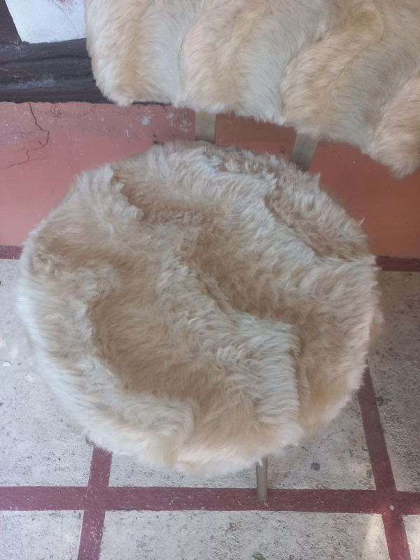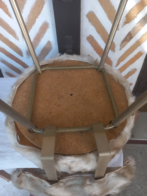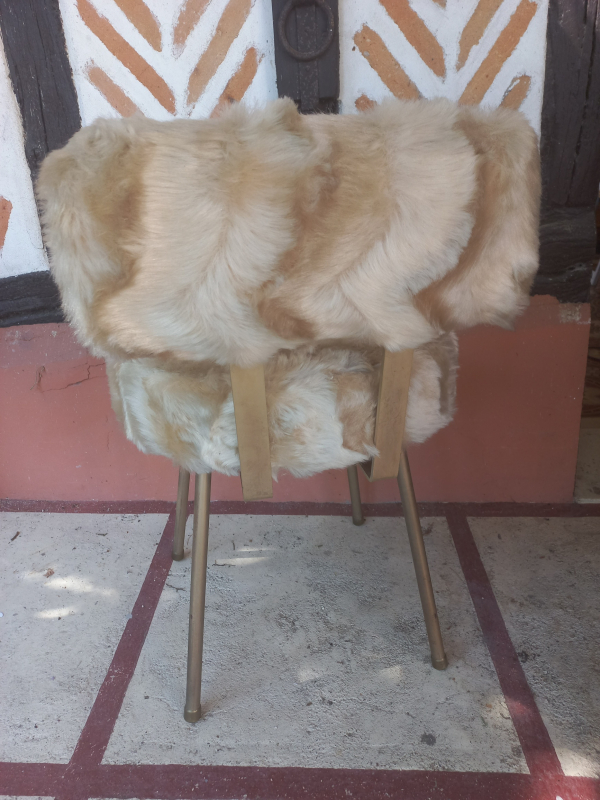 Chaise. Pelfran beige. Pieds fuseaux laiton. Chaise moelleuse recouverte de moumoute, fausse fourrure en Crylor brevetée par Rhône Poulenc. Marque pelfran par peltex. Fabrication française. Époque 1960 1970. L42xh70xp42. En vente dans notre boutique le pouf beige assorti. Envoi possible