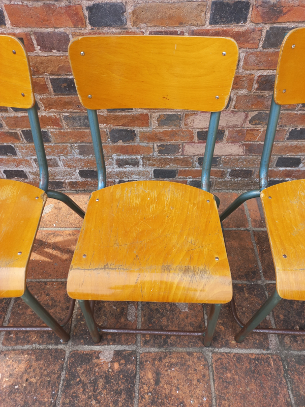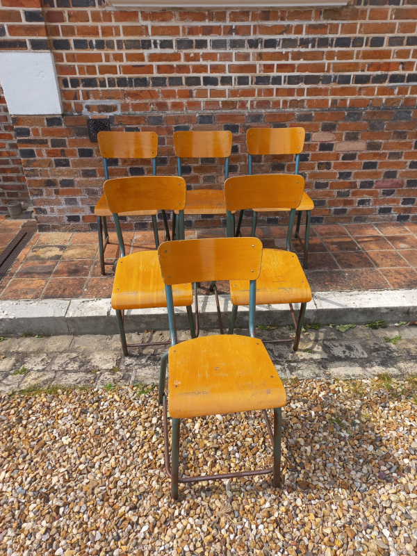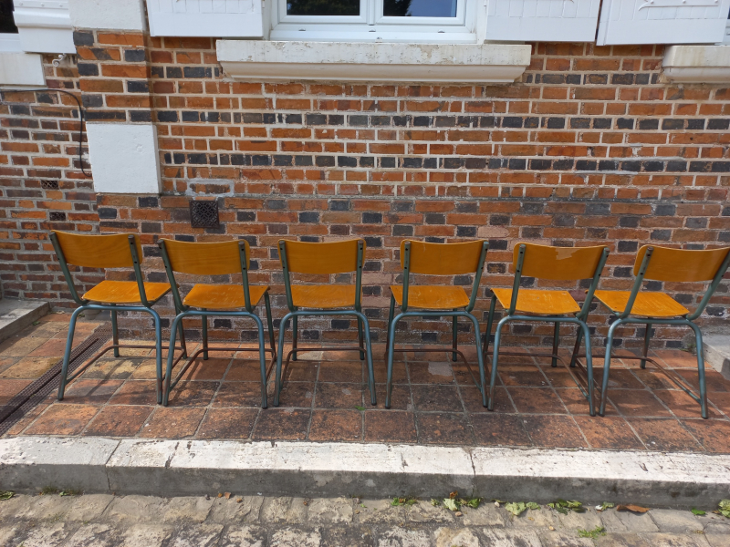 6 anciennes chaises d école vintage. Structure métal: vert métallisé et rouille avec barre transversale (rare) assise et dossier bois rivetés. Traces du temps et écritures d élèves gravée sur une assise. En dessous: tampon en 31f3. L48xh80xp47. Hauteur assise standard 45. 2 lots de 6 disponibles. 200€ : prix d'un lot. Retrait sur place pas d'envoi.