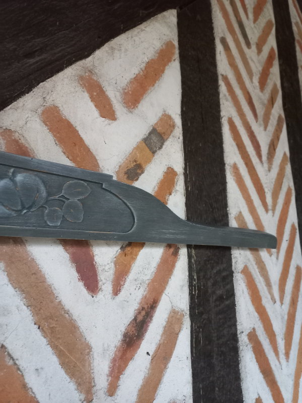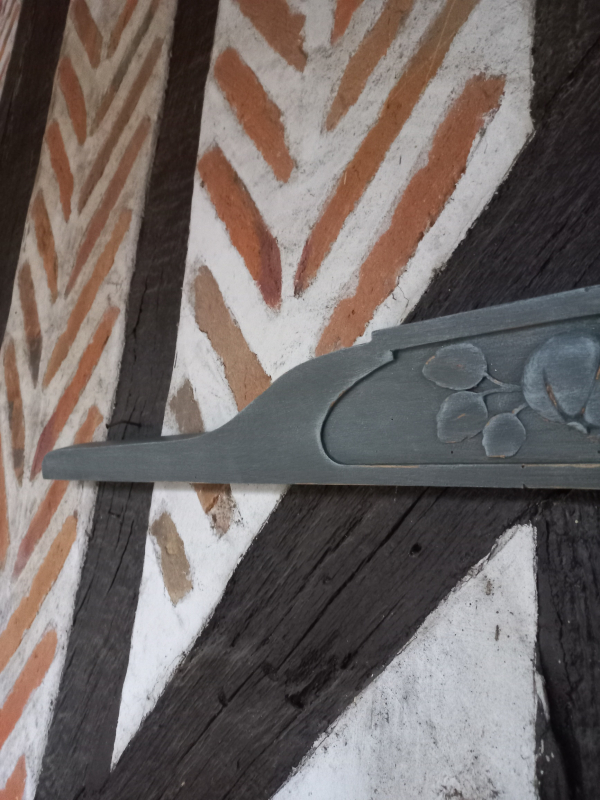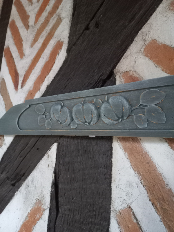 Grand fronton bois massif. Forme longiligne. Gris ardoise patine blanche effet vieilli. Décor central trois fruits et feuilles. Crochet arrière. Bel effet au dessus d'une porte. Style shabby chic, maison de famille. Ancien fronton d'armoire. L110xh7.5xp2.5.