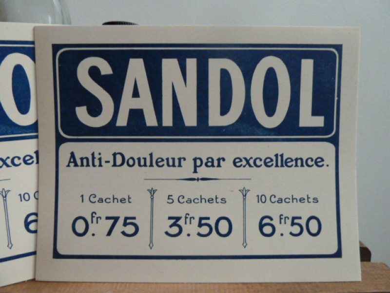 Ancienne étiquette affiche cartonnée de la marque SANDOL avec pour slogan "anti douleur par excellence 1 sachet 0.75 francs / 5 sachets 3.50€ francs / 10 sachets 10.50 francs". Publicité vintage provenant d'une ancienne usine pharmaceutique d'Orléans Loiret. Très sympa encadrée dans une salle de bain. l15 x h12. 2 Disponibles. 5 € pièce