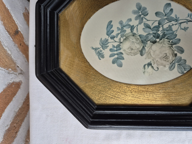 Elegant tableau octogonal représentant des roses anciennes. Cadre bois noir avec verre. Décor : roses anciennes sur tissu avec teintes délavées mises en valeur par un passe partout forme médaillon doré. Jolie patiné dorée vieillie. Crochet arrière. L25 x h30 x p2