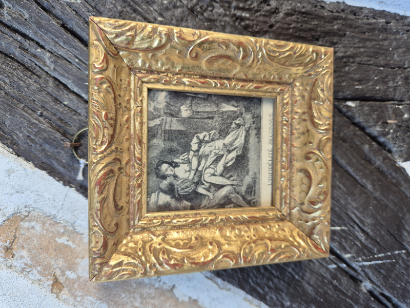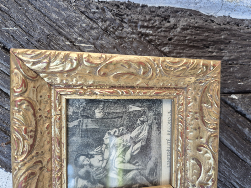 Tableau illustration ancienne noire et blanc représentant une scène du XVIII eme siècle : "infidélité reconnue ". Cadre bois doré avec assiette rouge. Moulure en parfait état. Crochet arrière. Petit format. L11 x h12 x p2.5