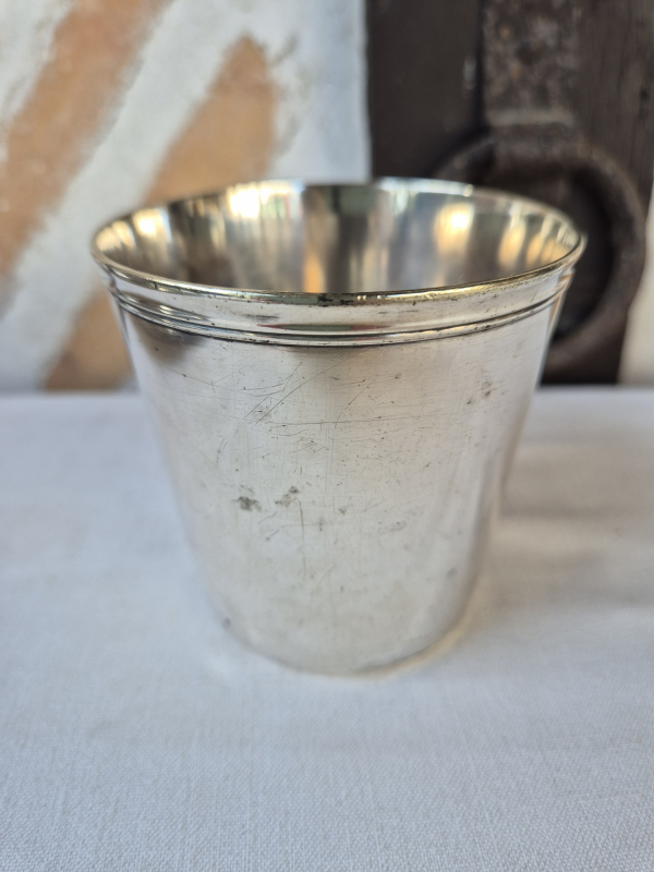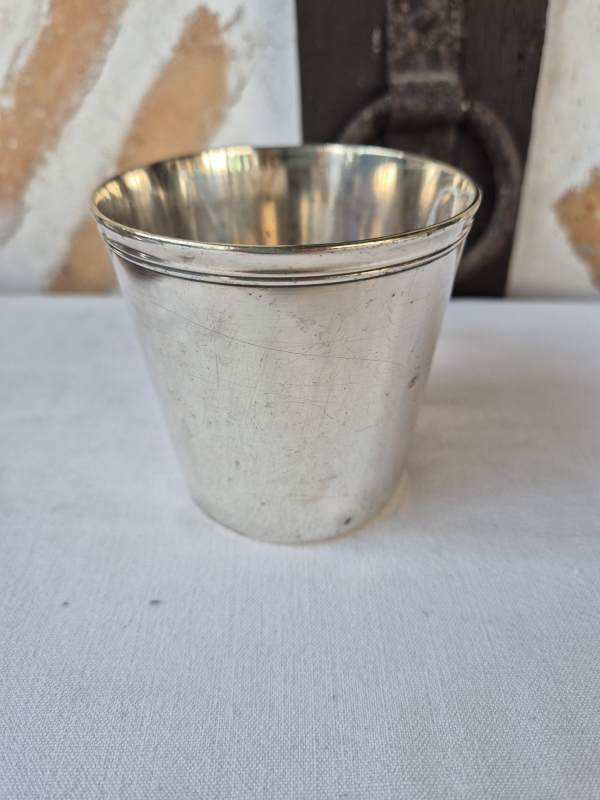 Timbale argentée ancienne. Design sobre. Jolie bordure. Intérieur vieilli. Poinçon "Cie Brunet". 1 petit renfoncement en partie basse. L8 x h8 x p8.
