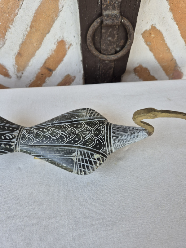 Sculpture oiseau Ibis. Corps en pierre de savon sculpté. Pattes et tête en laiton massif. Création artisanale. 1 éclat à la queue. Provenance Égypte. L29 x h11 x p10