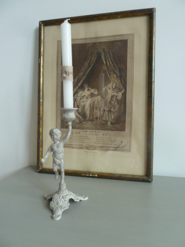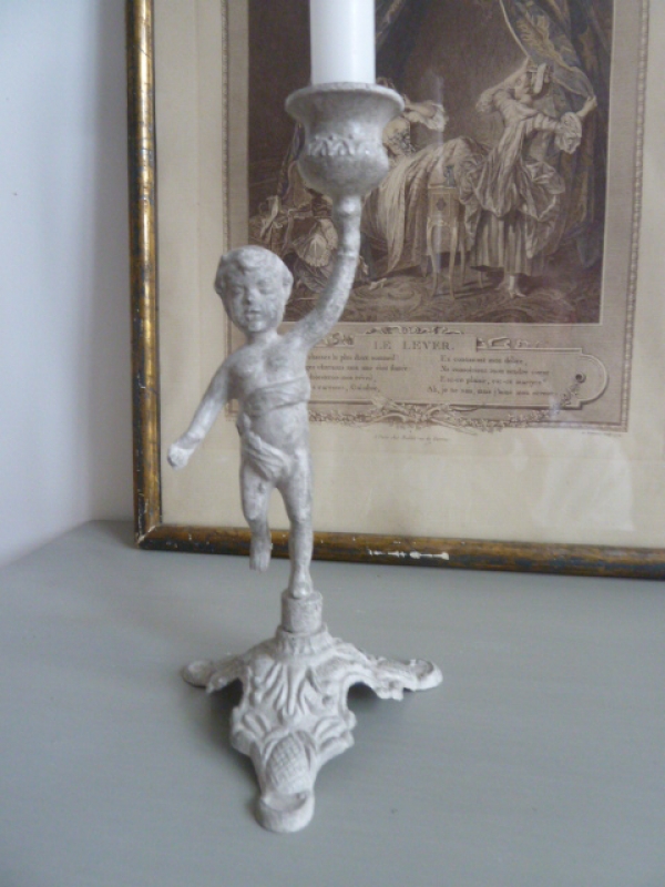 ELEGANT CHANDELIER REPRESENTANT UN CHERUBIN (ANGE) AVEC SON BRAS EN L'AIR. METAL.PIED TREPIED DELICATEMENT CISELE. PATINE LIN GRISE. 21X9.