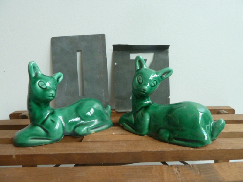 STATUETTE STATUE DECORATION COUPLE DE PETITS FAONS VERTS . TEINTE VERTE. EN CERAMIQUE VERNISSEE. INTERIEUR CREUX REMPLI DE CIMENT. 16X16. PAS DE SIGNATURE MAIS SUPPOSITION SAINT CLEMENT. 13X10