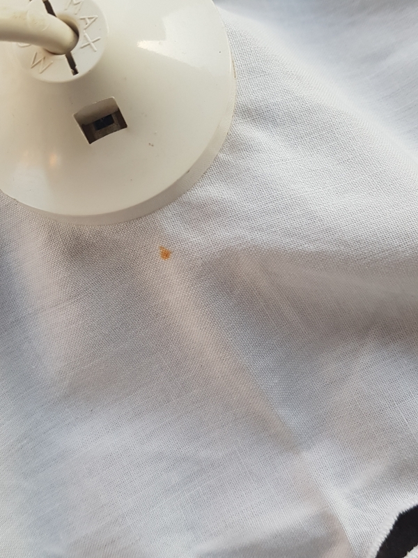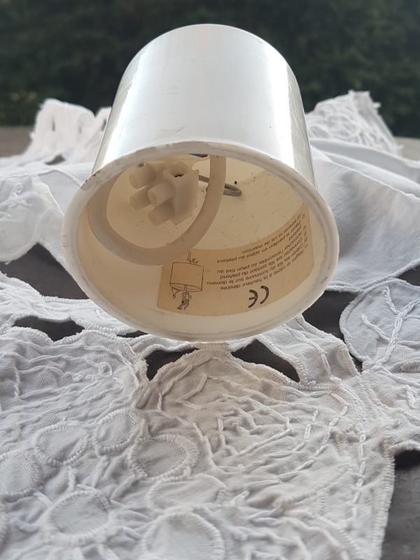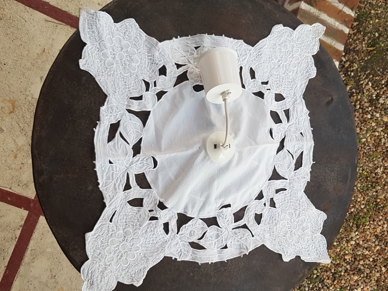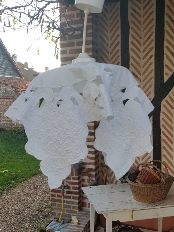 Lustre plafonnier suspension tissu. Coton blanc ancien brodé de motifs fleurs et feuilles. Diamètre structure 20cm. Hauteur cable + pavillon 20cm. Hauteur totale 45cm. Culot à visse E27. Ampoule non fournie. Petite trace de rouille visible sur une photo.