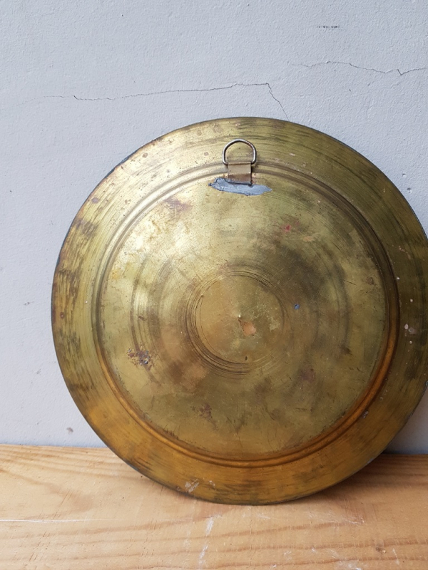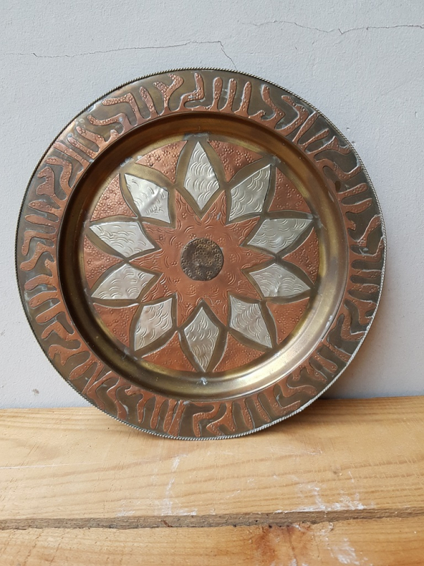 Elégant plateau marocain. Laiton, cuivre et fer blanc. Motif soleil. Peut également être accroché au mur. Diamètre 24.5. Parfait état. Idéal pour déco éthnique.