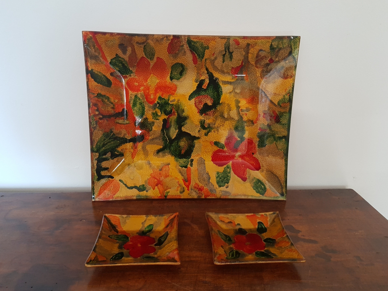 1 grand plat rectangle et 2 petits carrés en verre. Décor fleur rouge sur fond abstrait de couleur or. Légèrement creux. Parfait état. Parfait pour vide poche ou plat pour gâteaux apéritif...Grand 32x26. Petits 10x10.
