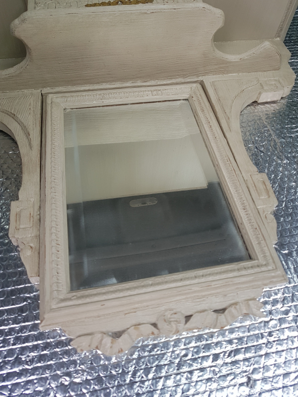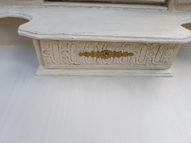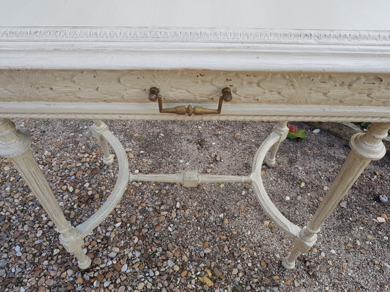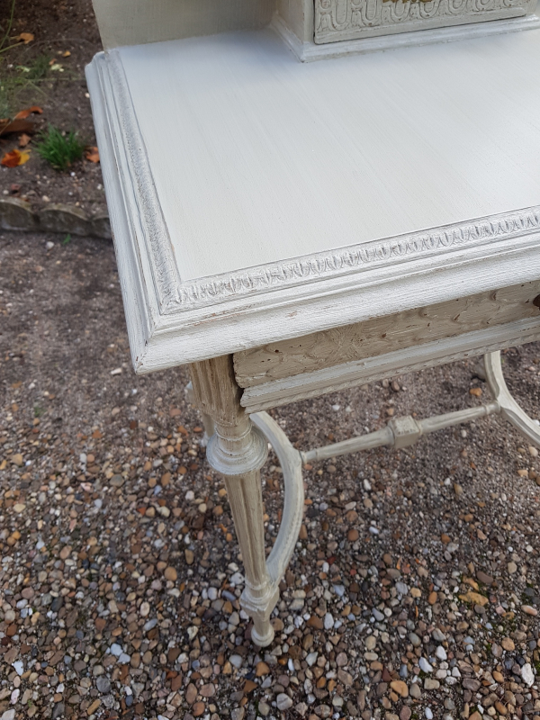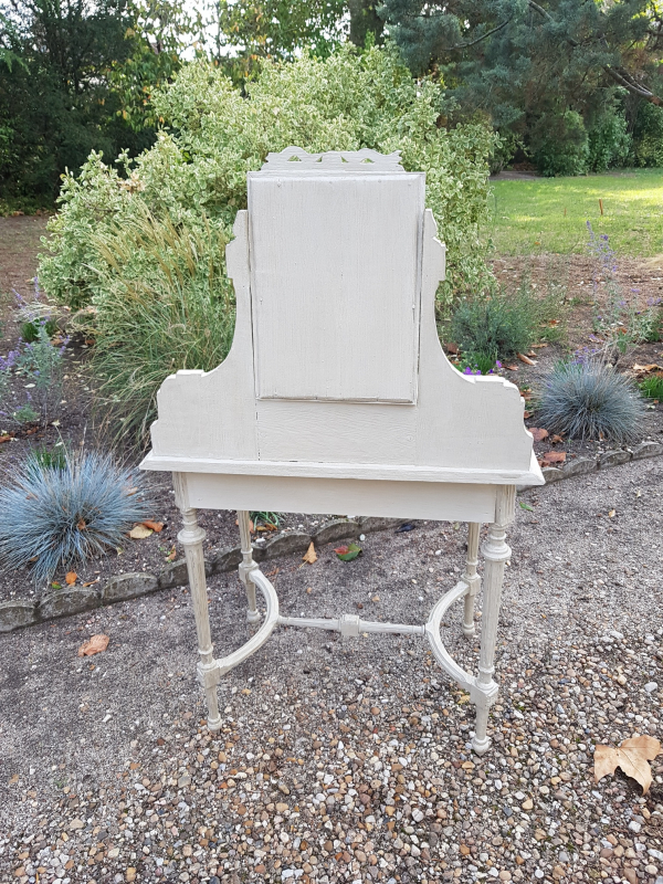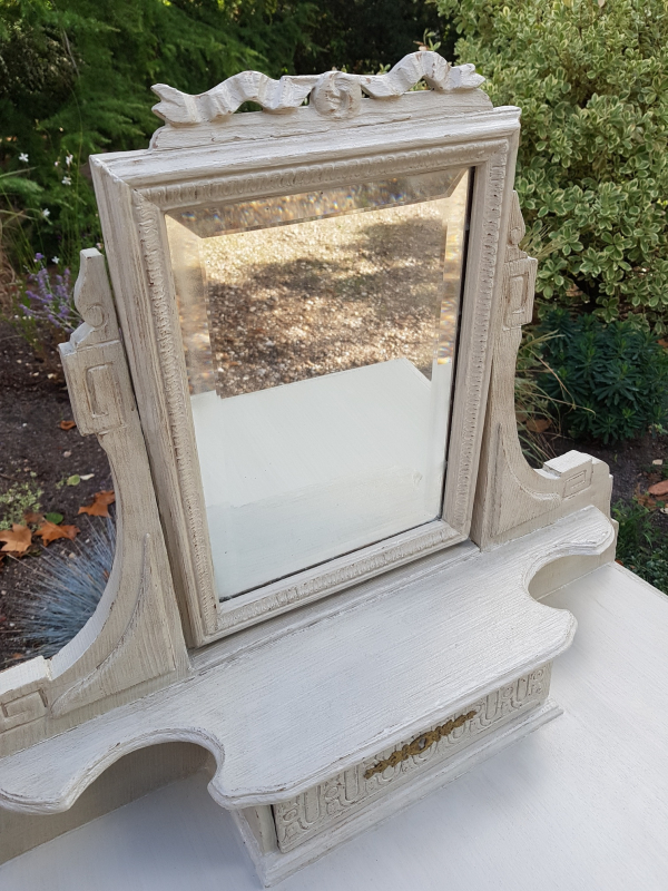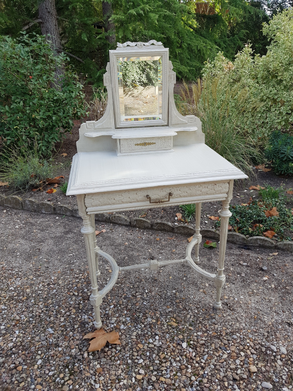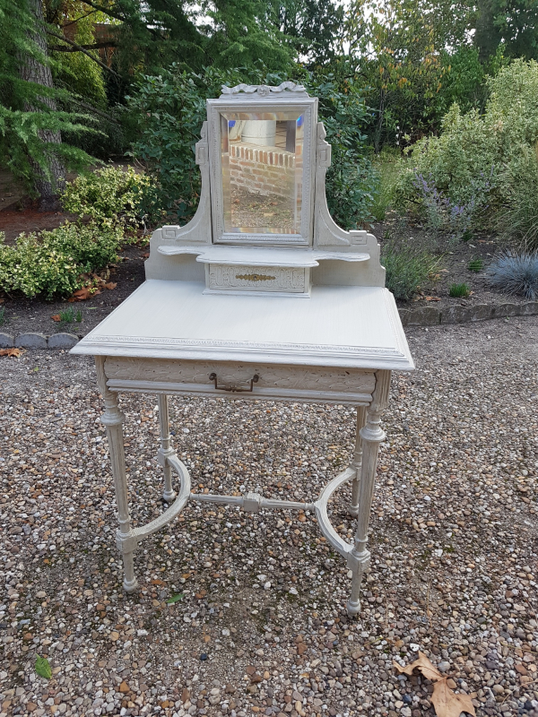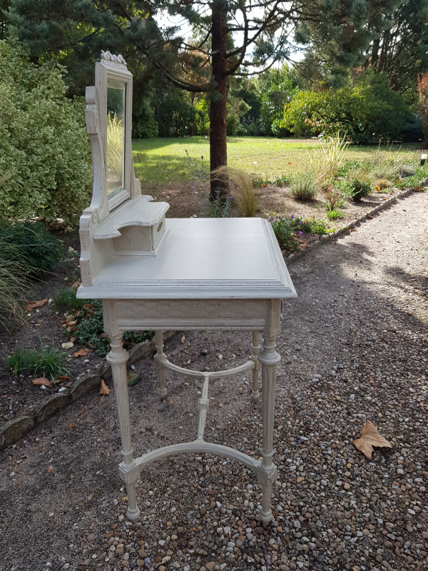 Ancienne coiffeuse rénovée et patinée en greige grisé. Pieds cannelés avec entretoise courbe. 2 tiroirs: 1 petit et 1 grand. Miroir d'origine bizeauté (légèrement flou à certains endroits) basculant avec ruban enguise de fronton. Entrée de serrure aspect laiton. Poignée centrale laiton. Elegantes moulures avec motifs sculptés. Miroir 20.5x28.5. L70xh153xp48.
