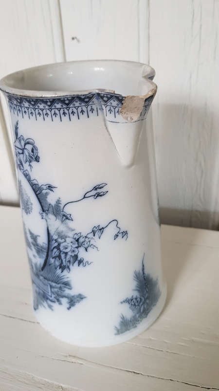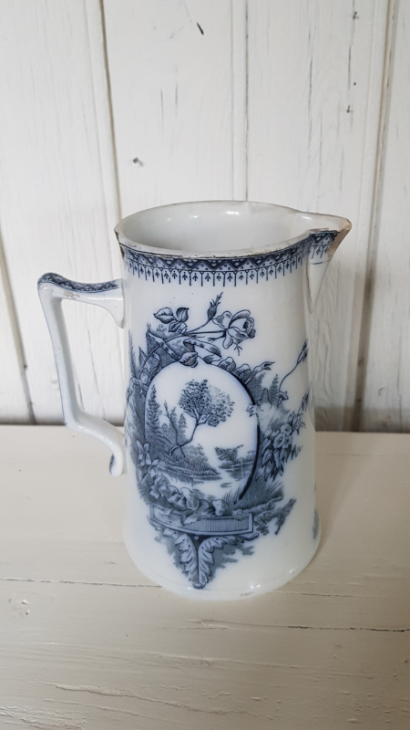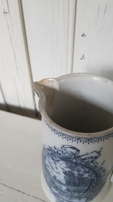 Pichet broc ancien. Céramique de saint amand. Très beau décor bucolique bleu sur fond blanc. Une ébréchure au niveau du bec et une sur le haut. Pièce signée. Peut demeurer un objet esthétique et usuel ou se transformer en vase l15 x H19 x p11.