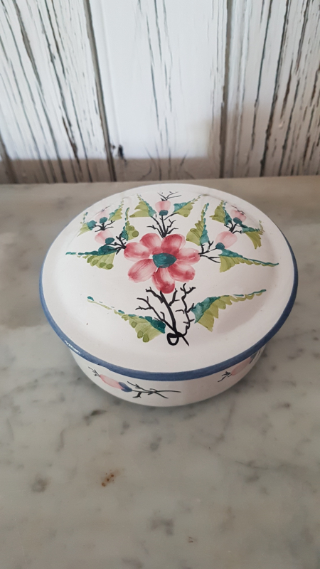 Boîte coffret à bijoux, vide poche céramique blanche peint à la main. Liseret bleu. Elégantes fleurs roses avec feuilles vertes. Couvercle bombé. Parfait état. Epoque 1980. Pièce numérotée 18. L13 X h7.