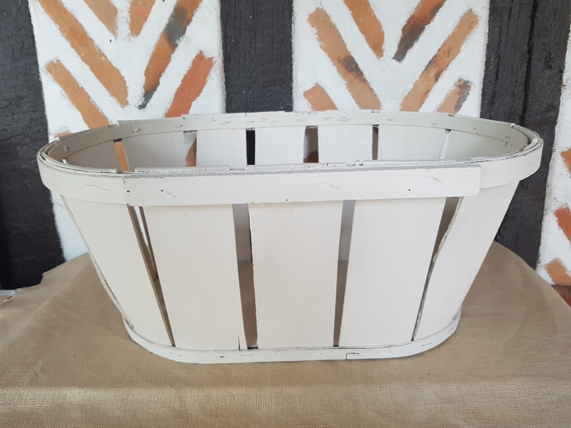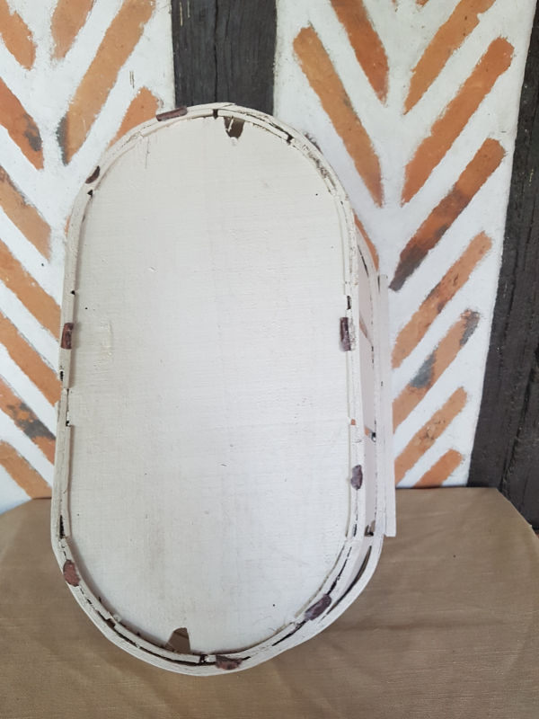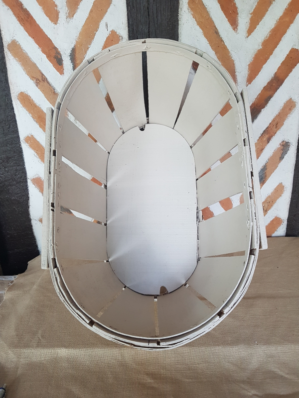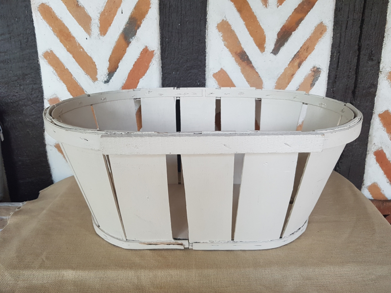 Ancienne caisse à fruits. Bois. Peinte couleur lin clair. Forme ovale composée de lattes de bois. De multiples utilisations possibles : porte revues, coffre à jouets, panier à tricots, corbeille linge de maison...l53 x h 23 x p35. ref 1271
