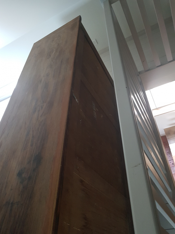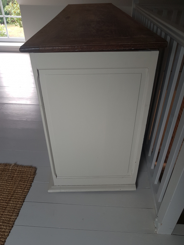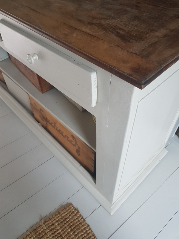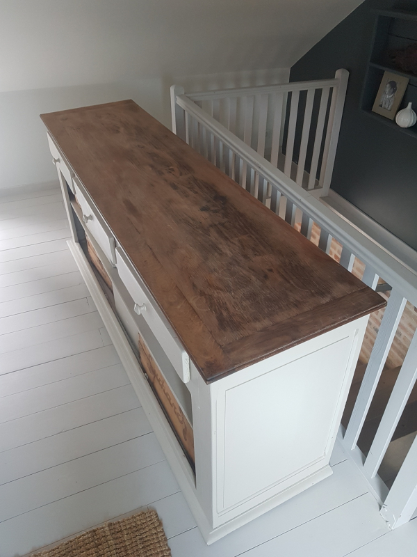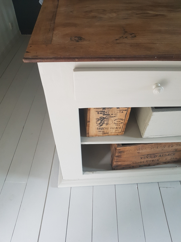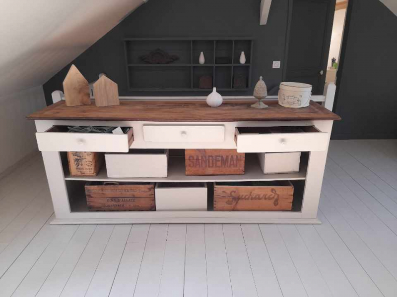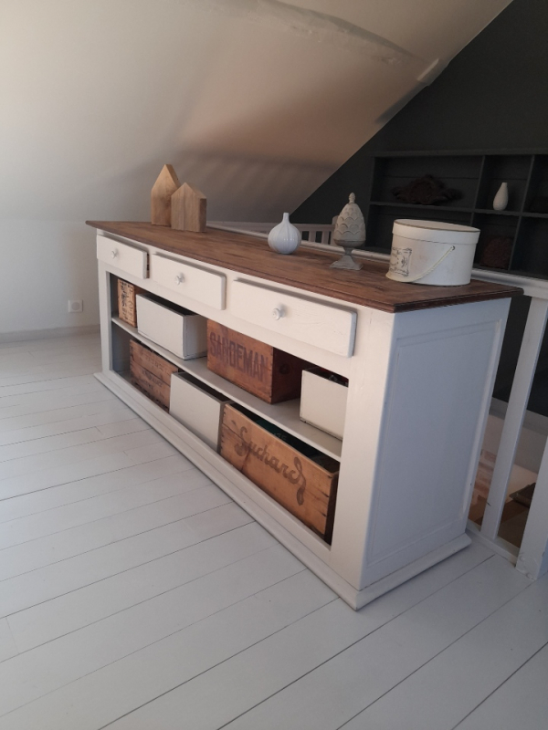 Grand buffet bas style meuble de métier style comptoir de mercerie, meuble de drapier. Meuble ouvert avec une grande étagère. 3 tiroirs en façade dont un décoratif. Plateau chêne brut. Meuble couleur lin. Belles dimensions. Possibilité d'acquérir les caisses visibles sur les photos : 3 caisses à vin récentes peintes couleur lin. 4 anciennes en bois brut (vin d'Alsace, Sanderman, Suchard...) Prix 50€le lot. l203 x h83 x p53
