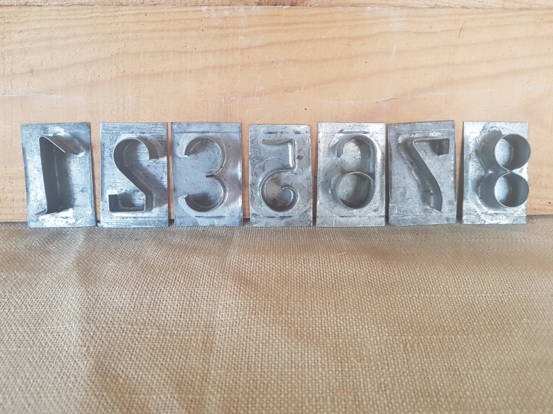 Lot de 7 chiffres métal : 1 2 3 5 6 7 8 Manque le 4. Gans poinçons. Bel effet pour déco style industriel ou utilisation pour poiçonner du bois de l'argile. l3.8xh6xp2
