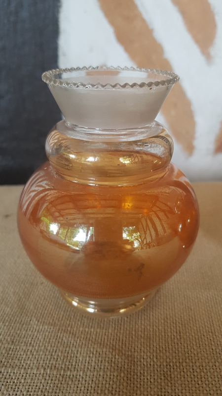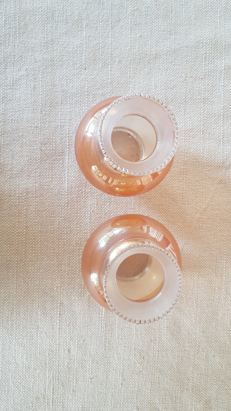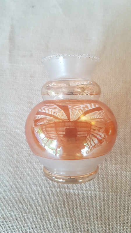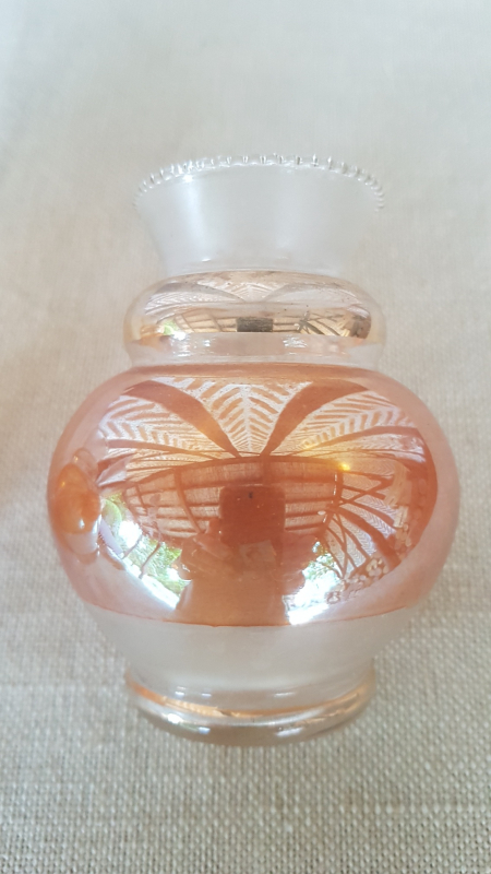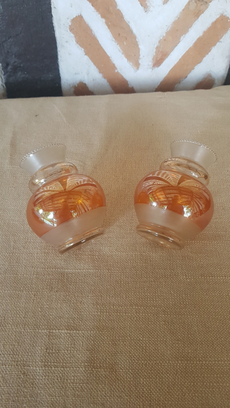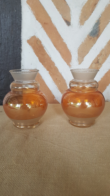 Paire de petits vases. Verre. Forme cylindrique avec colerette de billes en partie supérieure. Partie verre sablé. Partie dorée. Partie cuivre irisée. Epoque 1930. Parfait état. L7xh10xp7. Ref1519.