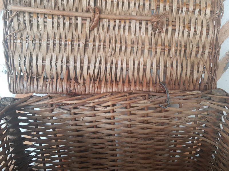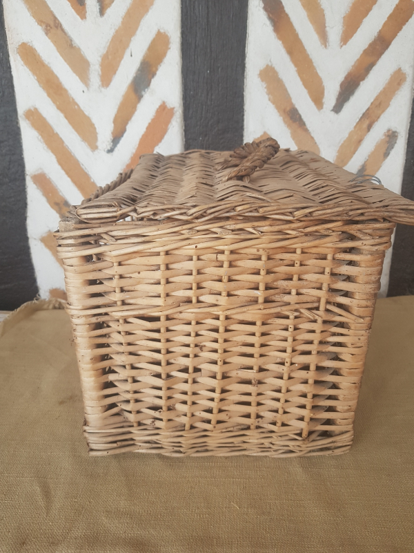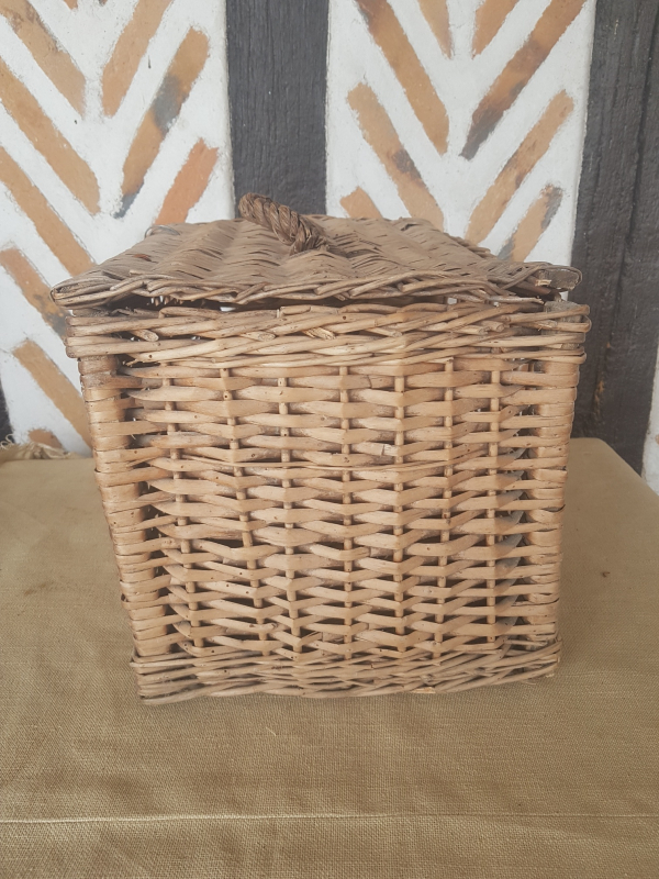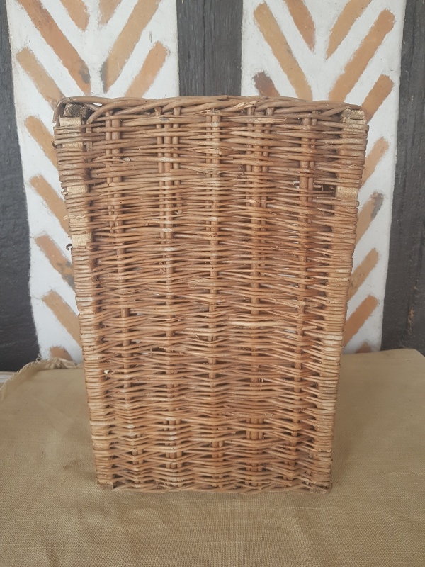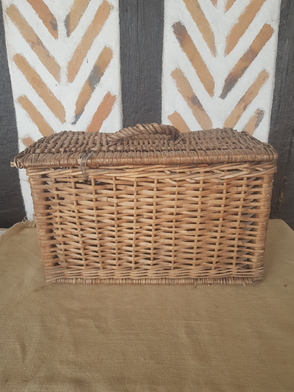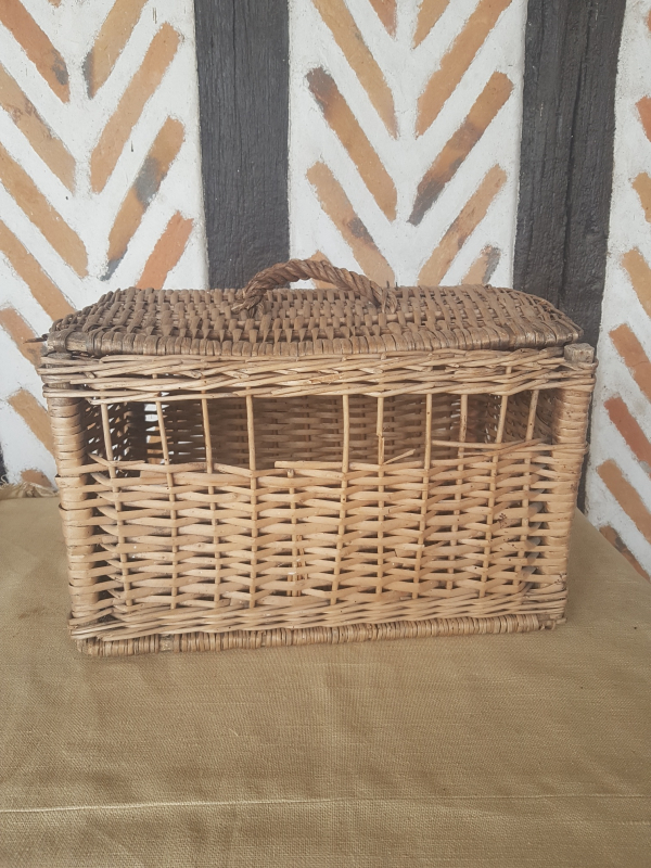 Ancien panier de marché pour transport: volailles lapins, chat osier. Forme rectangulaire. Poignée sur le dessus. Quelques traces du temps. Peut servir de coffre à jouets, à tricot, porte revues...l41xh29xp29.
